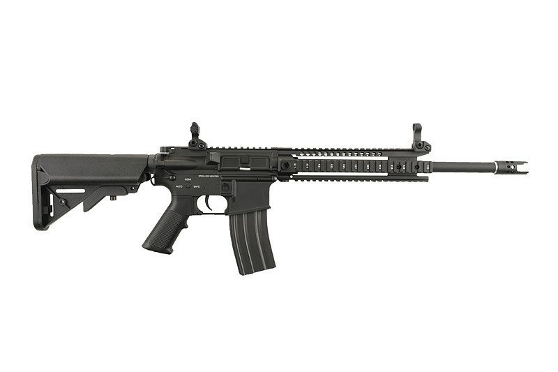 Replica este construita predominant din aliaj zinc-aluminiu, cu elemente critice din otel (suruburi, pini, prindere curea), oferind rigiditate si rezistenta in timp. Corpul si ansamblul RIS sunt anodizate, iar finisajul exterior este realizat prin vopsire electrostatica cu pulbere, procedeu ce asigura o rezistenta superioara la uzura si coroziune. Patul tip SF si manerul pistol sunt realizate din polimer rezistent si adapostesc bateria.
